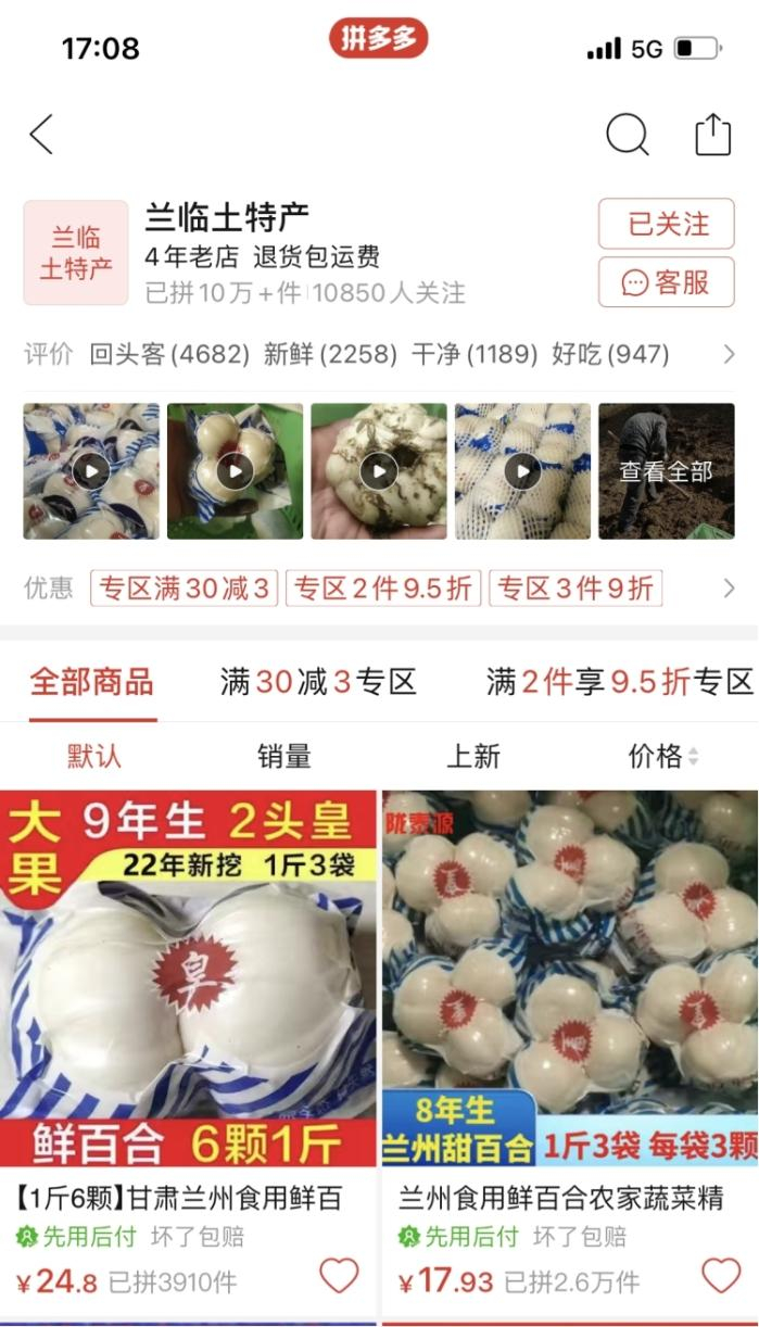 王茂盛经营的拼多多“兰临土特产店”显示已拼10万+,1万多人关注。