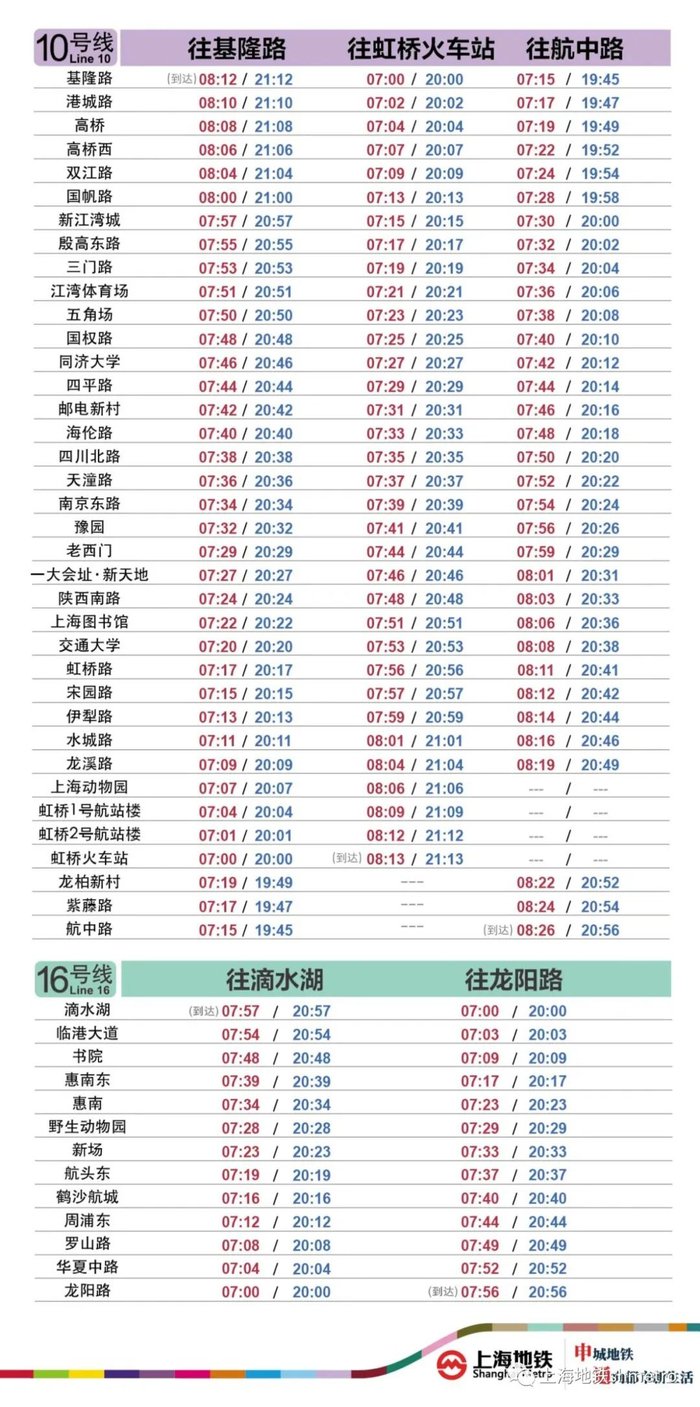 上海地铁:3、6、10、16号线运营时段均为7至20时