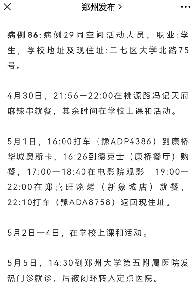 北京商报记者核实郑州发布在5月7日凌晨1点发布的流调后发现,行程中显示,其在5月2日-5月4日的行动轨迹均显示为“在学校上课和活动”。