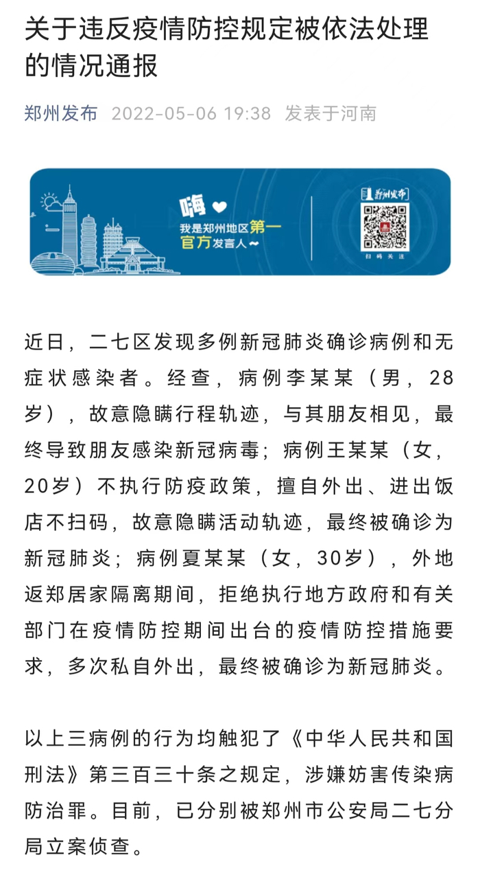 另据郑州二七区新冠肺炎疫情防控指挥部发布的《关于违反疫情防控规定被依法处理的情况通报》显示,病例王某某等4人的行为均触犯了《中华人民共和国刑法》第三百三十条之规定,涉嫌妨害传染病防治罪。目前,已分别被郑州市公安局二七分局立案侦查。