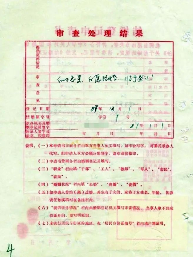 1981年1月1日,修订后的《中华人民共和国婚姻法》开始施行。此时的婚姻法关于结婚年龄的要求已改为“结婚年龄,男不得早于二十二周岁,女不得早于二十周岁。晚婚晚育应予鼓励”。1987年,结婚登记档案变成了竖表,题名改为“结婚登记申请书”,背面是“审查处理结果”,边框也变成了红色,登记项目更加丰富、全面、规范。除了结婚人基本信息外,还增加了照片。