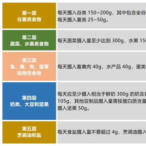 学龄儿童膳食宝塔形象化的组合,遵循了平衡膳食的原则,体现了在营养上比较理想的基本食物构成。宝塔共分为 5 层,各层面积大小不同, 体现了 5 类食物和食物量的多少。