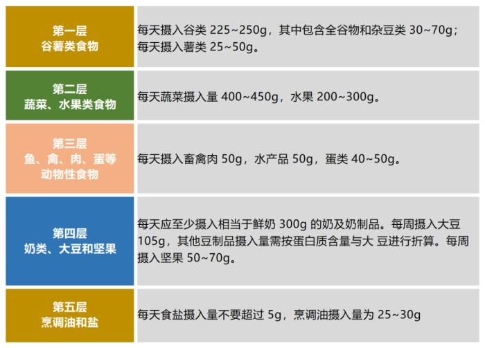 5类食物包括谷薯类、蔬菜水果、畜禽 鱼蛋类、奶类、大豆和坚果类以及烹调用油盐。