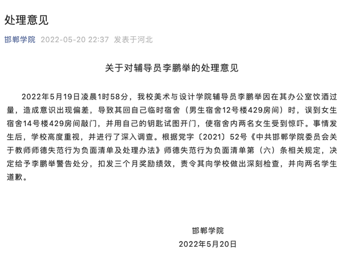 邯郸学院发表的处理意见显示:2022年5月19日凌晨1时58分,我校美术与设计学院辅导员李鹏举因在其办公室饮酒过量,造成意识出现偏差,导致其回自己临时宿舍(男生宿舍12号楼429房间)时,误到女生宿舍14号楼429房间敲门,并用自己的钥匙试图开门,使宿舍内两名女生受到惊吓。