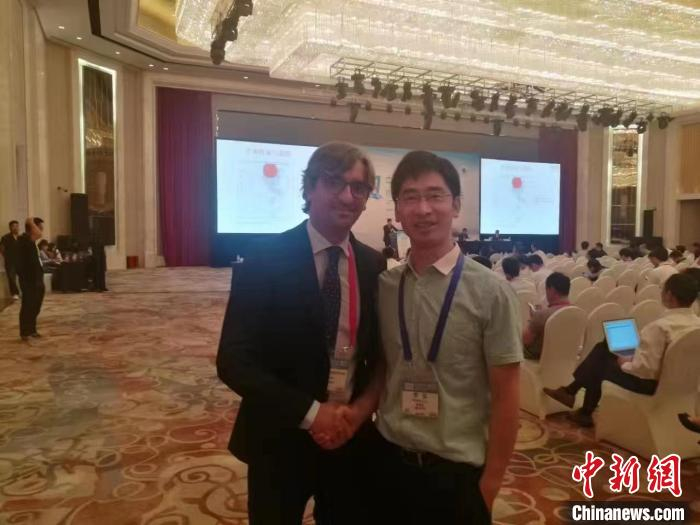 在上海东方论坛会场罗猛(右)与国际胸外科专家岗查雷斯交流。 受访者提供