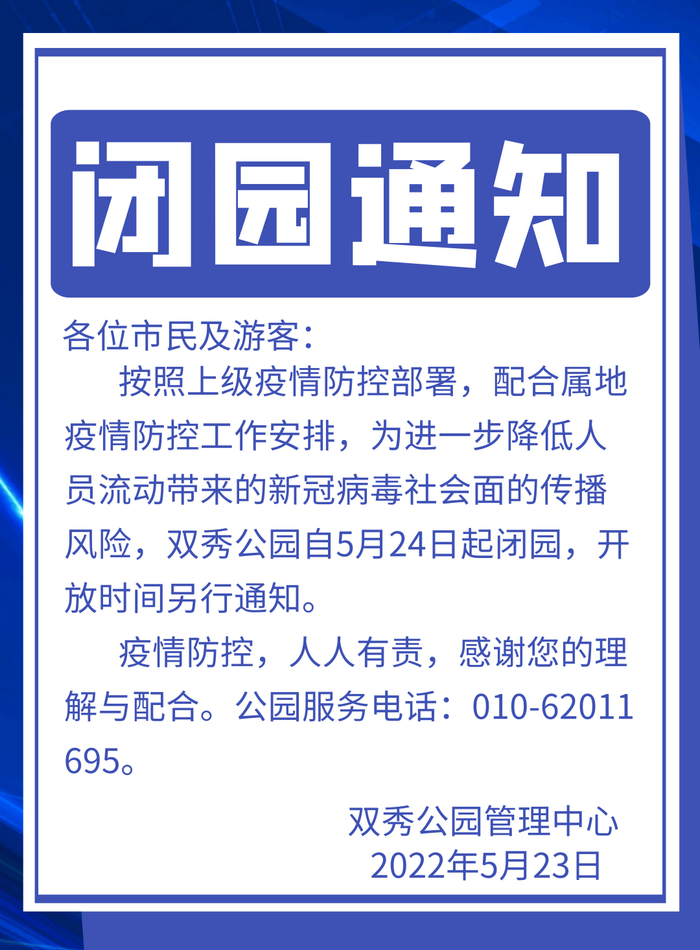 新京报讯 据双秀公园官微消息,按照上级疫情防控部署,配合属地疫情防控工作安排,为进一步降低人员流动带来的新冠病毒社会面的传播风险,双秀公园自5月24日起闭园,开放时间另行通知。