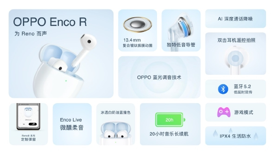 全新的OPPO Enco R真无线耳机,产品名取自Reno的R,代表为Reno手机用户提供具有定制化体验的真无线耳机。OPPO Enco R外观延续Reno对色彩的探索,结合冰透白和奶油蓝两种颜色,呈现如同冰川海洋般的配色。同时OPPO Enco R为Reno用户打造全新个性化专属弹窗,让用户在使用耳机时,也能无缝体验色彩中的丰富情绪。配置上,OPPO Enco R采用13.4 mm 复合镀钛振膜动圈,实现比普通的 12 mm动圈释放多一倍的声音能量,音乐中每个细节都完美呈现,OPPO Enco R还具有独特的低音导管,为扬声器提供大音腔容积,让低音更具律动感。此外,OPPO Enco R搭载蓝牙5.2低延迟双传和游戏模式,带来绝佳的游戏体验;长达20小时音乐长续航、IPX4 生活防水,为用户提供无忧使用体验。