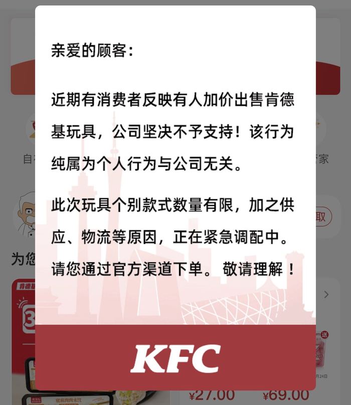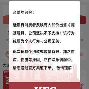 5月24日,肯德基官方App发布公告表示,对于近期有人加价出售肯德基玩具,公司不予支持,该行为纯属为个人行为与公司无关。此次玩具个别款式数量有限,加之供应、物流等原因,正在紧急调配中。
