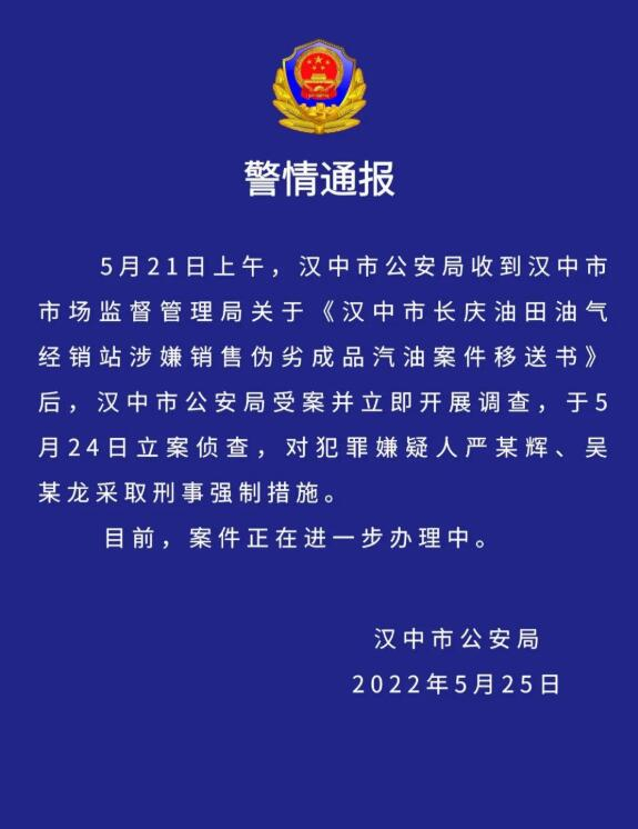 5月25日,“汉中公安”公众号发布警情通报称,5月21日上午,汉中市公安局收到汉中市市场监督管理局关于《汉中市长庆油田油气经销站涉嫌销售伪劣成品汽油案件移送书》后,汉中市公安局受案并立即开展调查,于5月24日立案侦查,对犯罪嫌疑人严某辉、吴某龙采取刑事强制措施。目前,案件正在进一步办理中。