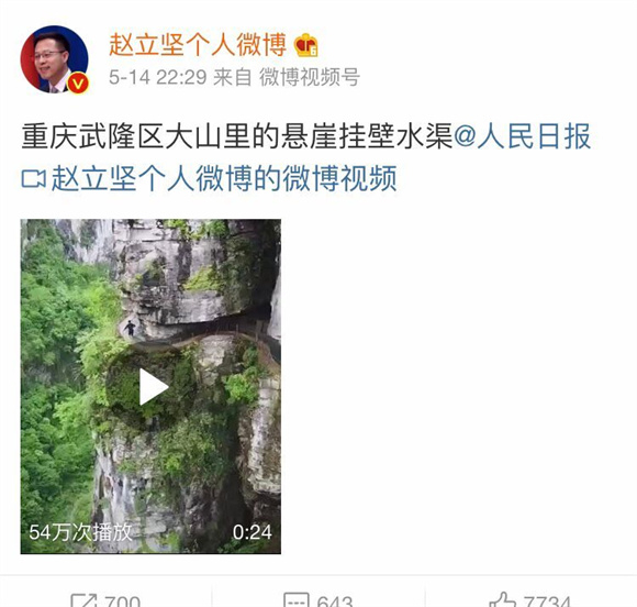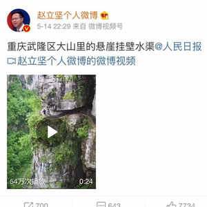 5月14日,外交部发言人赵立坚在个人微博上,发布了一则武隆悬崖挂壁水渠的航拍视频。视频中,一条盘山水渠围绕着峭壁流淌,旅行者踩着水渠边狭窄小路小心前行,脚下是峡谷深渊,眼前是绝美风景。此视频得到了众多网友的关注点赞,并被人民日报等相继转发。