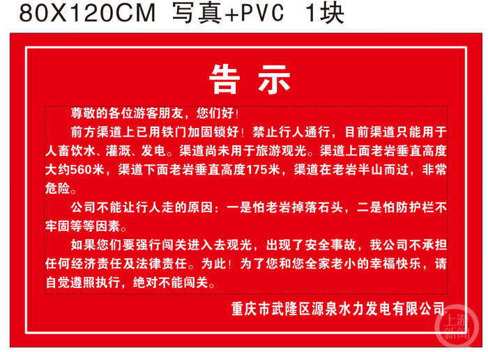 告示中表明:前方渠道上已用铁门加固锁好!禁止行人通行,目前渠道只能用于人畜饮水、灌溉、发电。渠道尚未用于旅游观光。渠道上面老岩垂直高度大约560米,渠道下面老岩垂直高度175米,渠道在老岩半山而过,非常危险。公司不能让行人走的原因:一是怕老岩掉落石头,二是怕防护栏不牢固等等因素。告示提醒,大家不要强行闯关进入观光。