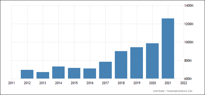 近年来印度越来越多地从中国进口抗生素,2021年时进口额已达12.6亿美元(图源:tradingeconomics.com)