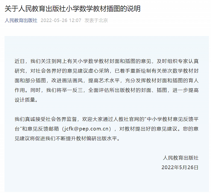 近日,人教版数学教材被网友吐槽插图太丑,人物形象歪嘴、斜视。5月26日,人民教育出版社发布关于小学数学教材插图的说明称,近日,人民教育出版社关注到网上有关小学数学教材封面和插图的意见,及时组织专家认真研究,对社会各界好的意见建议虚心采纳,已着手重新绘制有关册次数学教材封面和部分插图,改进画法画风,提高艺术水平,充分发挥教材封面和插图的育人作用。同时,我们将举一反三,全面评估所出版教材的封面、插图,进一步提高设计质量。