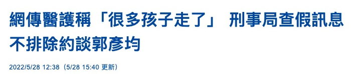 台湾艺人郭彦均5月25日分享与医护友人的聊天截图,对方称一位医院主任从4月5日开始就没休息过,天天在病房救人,“看到这(么)多孩子就这样走(了)”,结果被质疑“造谣”“制造恐慌”,引发亲绿网军炮轰。