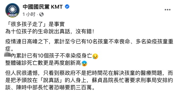国民党也在官方脸书发文,称“‘很多孩子走了’是事实”,指责台当局“不是把时间花在解决孩童的医疗问题,而是把矛头放在‘说真话’的人身上”。