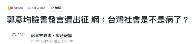 27日,有台网民在网络论坛PTT(批踢踢实业坊)发文,题为《从郭彦均事件看台湾社会是不是病了》,引发热烈讨论。该文指出,从郭彦均内文看是帮助医护友人呼吁减少群聚保持社交距离,希望大家能珍惜爱护台湾的医疗人员,“从上面真的找不太出攻击的点”。评论区里有不少人支持郭彦均,并感叹台湾“早就病了,不能批评政府了”。