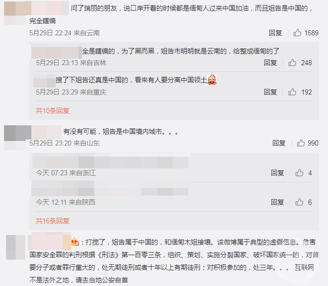 这条微博迅速引起网友关注,评论区则成了“翻车现场”,不少网友都对这则截图常识性的错误进行了批评:“姐告是中国的,不是缅甸”“姐告不是个市。姐告属于瑞丽市。”更有网友严肃的指出:“姐告属于中国,和缅甸木姐接壤。该微博属于典型的虚假信息。”