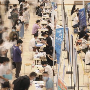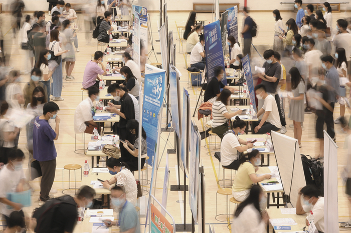5月29日,江苏南京,大学生在招聘展台前咨询。图/IC photo