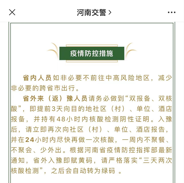 5月30日,河南省公安厅交警总队发布出行提示,其中提到,根据河南省疫情防控指挥部最新通知,省外入豫即赋黄码,请严格落实“三天两次核酸检测”,之后会自动转为绿码 。