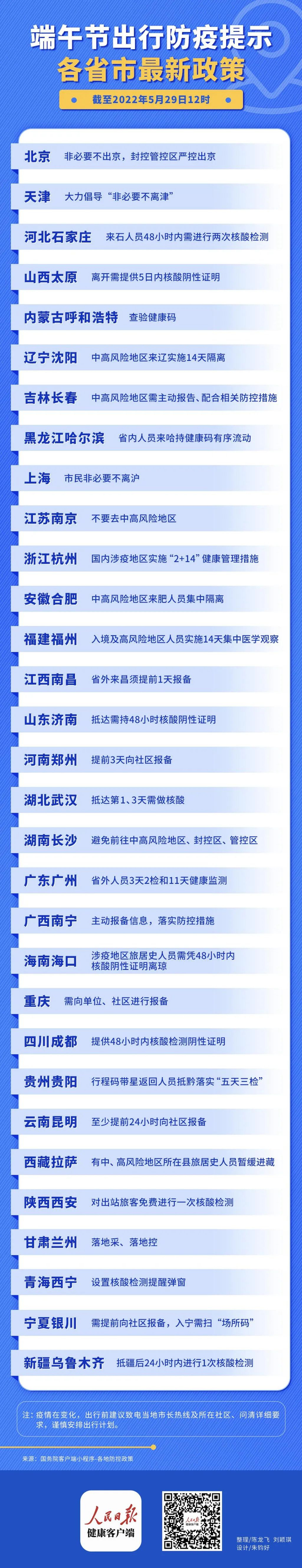 人民日报健康客户端梳理了截至2022年5月29日12时各省市防疫政策汇总,供大家参考,最终以当地发布情况为准。