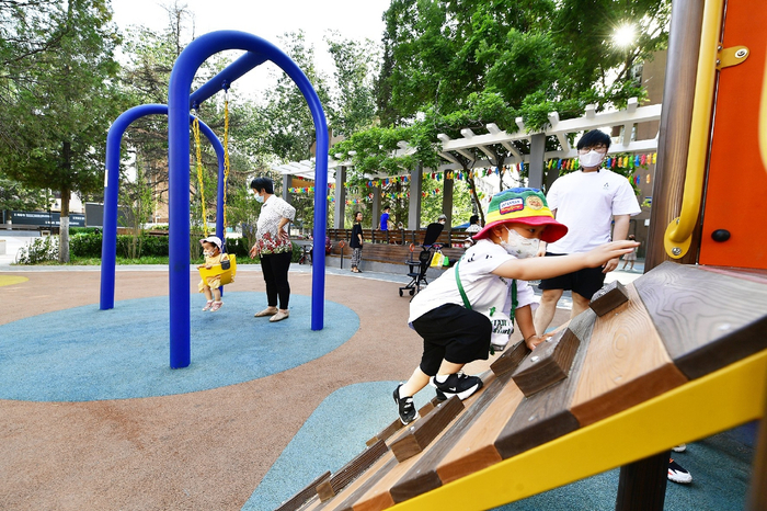 以“一米高度”看城市会有什么不一样的体验?秋千、爬架、彩绘激活社区广场和城市转角,孩子在家门口就能撒欢儿;开放绿地,磨平台阶,儿童友好元素装点滨河空间,孩子们近水亲水也没有安全隐患……经过“适小化”改造,城市副中心承载童声笑语的儿童友好空间越来越多。