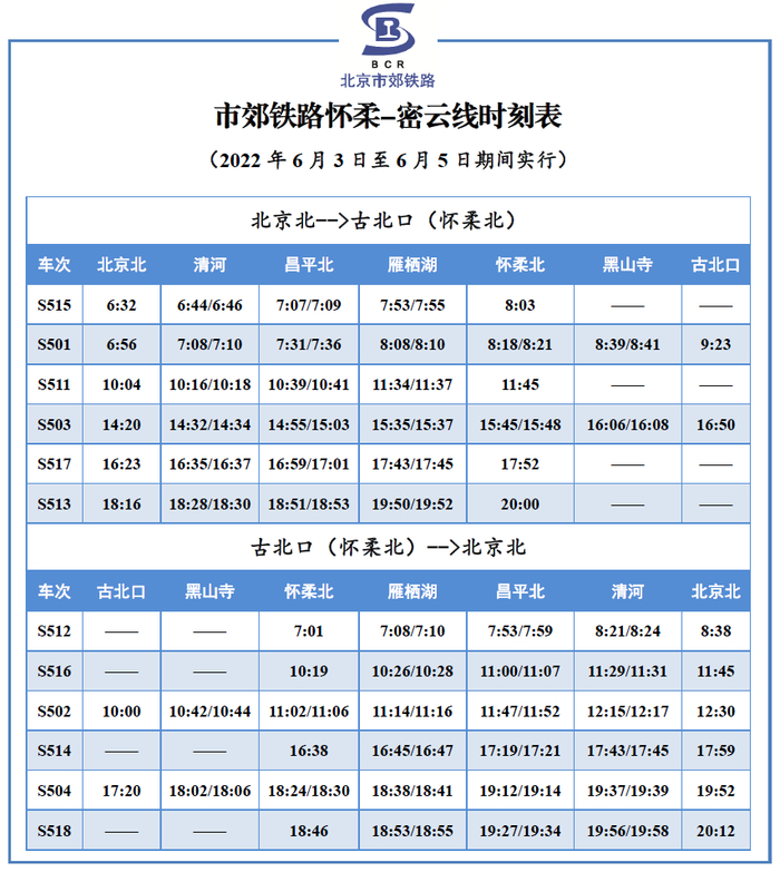 根据铁路运输调整通知,为满足市民“端午”小长假出行需求,2022年6月3日至6月5日期间,市郊铁路怀柔-密云线、通密线和S2线列车开行方案调整。怀柔-密云线,临时恢复S515、S516、S517、S518次列车,日开行列车6对,列车时刻表如下所示。