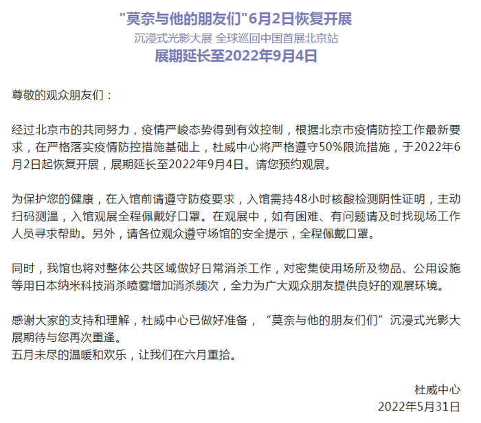 6月3日起,木木美术馆(798馆)、北京世园公园恢复对外开放。市属公园的游船、游艺设施按照50%限流有序逐步恢复运营服务。