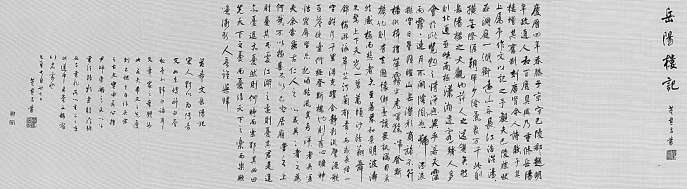在中国的书画界,一直有一个优秀的传统,就是书者喜欢抄录脍炙人口的诗文,既是雅玩,也是对先贤致敬。而《岳阳楼记》自其甫出,就一直是历代书法作品中的重要题材。但迄今为止,最有名的可能要算明代书法家董其昌的作品。明万历三十七年(1609),董其昌55岁,他在补福建副使前四个月赋闲在家时,信笔写下了《岳阳楼记》。观览全卷,字大如拳,流畅劲健,通篇数百字一气,极见功力,堪称董氏行书中的精妙之作。仔细赏读,融晋、唐、宋、元各家风格于一体,笔力遒劲,悠闲自得,既见米芾风骨,又显旷世之志,隐现虑思,抒情寓怀。为什么董其昌的《岳阳楼记》写得这么好呢,这既与他正处于创作成熟期有关,也和当时的处境、心境有关。这一年,久居官场的董其昌像历代文人为官一样,俯首辅弼,忠心不二,但又小心翼翼,矛盾重重。因此,长卷《岳阳楼记》的字里行间,隐隐流露出董其昌于仕途、于人生的一种复杂心态。