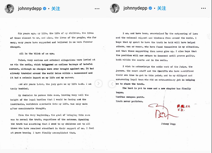 “6年前,我的人生被永远改变。”官司结束后,约翰尼·德普发文写道。