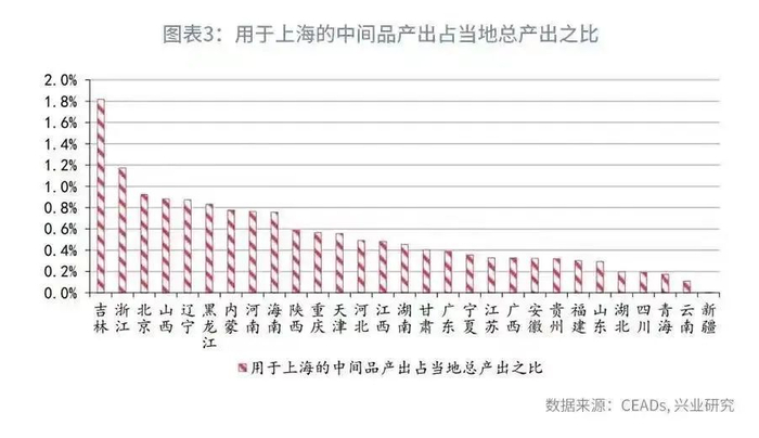 受影响的当然不只是长三角。兴业银行首席经济学家鲁政委在《上海疫情影响了谁?》一文中指出,吉林、浙江、北京、山西和辽宁用于上海的中间品产出占当地总产出的比例较高,表明上述地区较为依赖上海的需求。其中,吉林居民服务业产出用于上海的比例高达46.2%,浙江非金属矿制品业用于上海的中间品占总产出的比例高达28.5%,显示出较高的依赖度。
