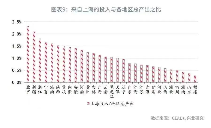 除此之外,北京、新疆、浙江、宁夏和海南等地区的生产更加依赖来自上海的投入,来自上海的投入品占北京的技术服务业、交运设备行业和卫生社工行业比重分别为4.3%、4.2%和3.5%,占据浙江交运设备、金属冶炼和仪器仪表行业的比重分别为5.1%、3.2%和3.1%。