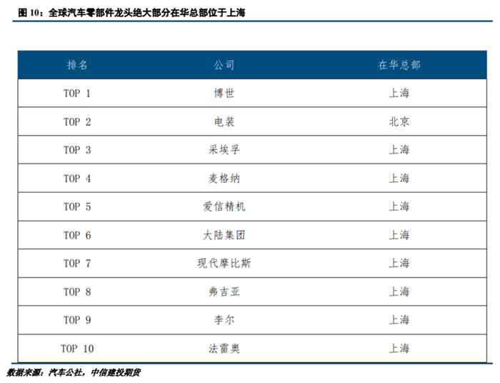 Wind数据显示,汽车产业链中办公地为上海的上市公司数量为51家,占总数7.24%,总营收为15817.9亿元,占比接近20%,均位列全国第一。在零部件方面,博世、采埃孚、麦格纳等全球前十大汽车零部件集团中,有九家都将中国总部驻扎在上海,并且上海及周边还布局着大量关键性零部件供应商。