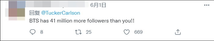 然而,卡尔森这番批评拜登的言论,却得罪了防弹少年团的粉丝群体。他们跑到卡尔森这条推特的评论区,刷评反击、制作梗图嘲讽、甚至还要求卡尔森道歉并辞职……