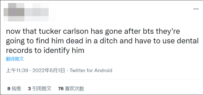 甚至还有粉丝恶劣地诅咒道:“现在塔克·卡尔森盯上了防弹少年团,他们会发现他死在沟里,只能用牙科诊断记录来确认身份。”