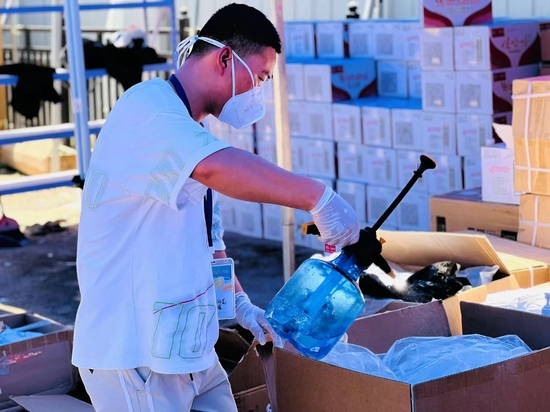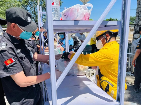 现场卡口处,外卖员、快递员在完成“健康宝”查验后方可进入场地,将外卖、快递等居民生活物资按货架分区域摆放,整个运转流程规范、有序。