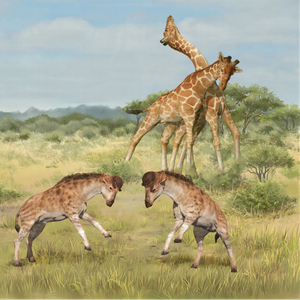 现生长颈鹿出现之初,也遭遇过类似的环境。约700万年前,东非高原也由森林环境转变为开阔的草原,远古长颈鹿赖以生存的环境逐步消失,促使它们必须适应新的变化。本来身体比较高大的长颈鹿,可能在这个时期发展出了“甩动脖子和头部攻击竞争对手”的方式。在性选择的加持下,200万年的时间内,长颈鹿的颈部迅速加长,成为现生的长颈鹿属(Giraffa),从而占领了取食高处树叶这样相对边缘化,但回报颇丰的生态位。长颈鹿与其他物种竞争较少,不必与斑马、羚羊等动物比赛啃食那些难以消化的草本植物。