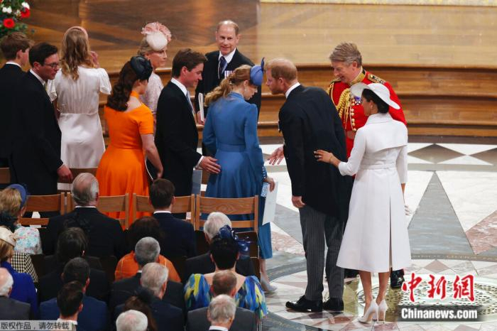 不过,哈里和梅根最终落座在比阿特丽斯公主和尤金妮公主附近,而查尔斯王储夫妇、威廉王子夫妇则落座在过道另一边的位置上。
