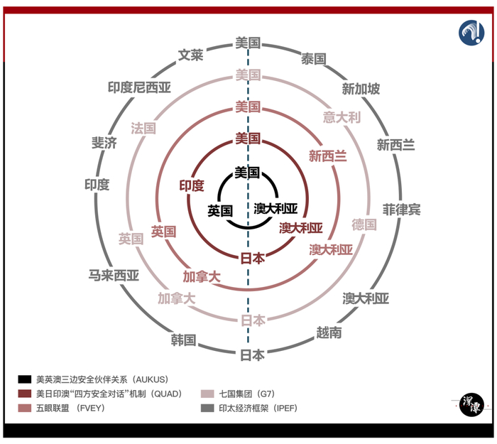 这是一张美国组建的联盟分布图,可以明显看出,在美国的盟友体系中,日本在非英语国家中的地位从未如此突出。