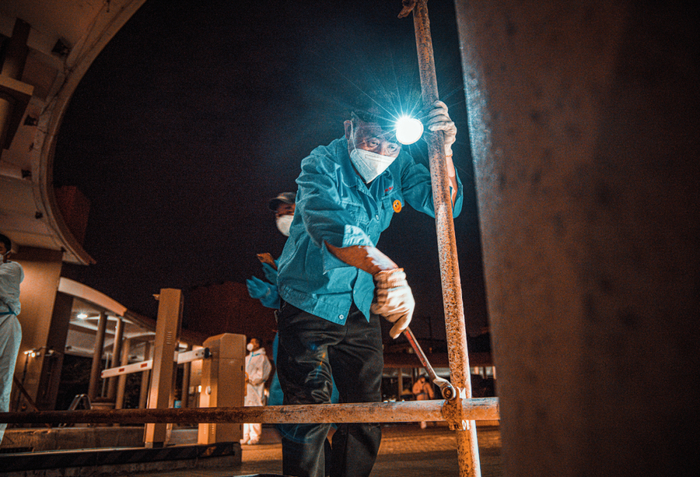 2022年6月1日,零点即将到来之际,上海市宝山区锦秋花园社区物业开始拆除铁皮围栏,为小区解封做准备。摄影/徐易飞