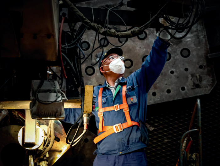 2022年4月23日,上海电气核电集团有限公司的工人在车间工作。4月下旬,上海电气集团股份有限公司在确保企业防疫形势安全可控的前提下,以“闭环生产”模式,力保重大项目,做好防疫生产“两不误”。图/新华
