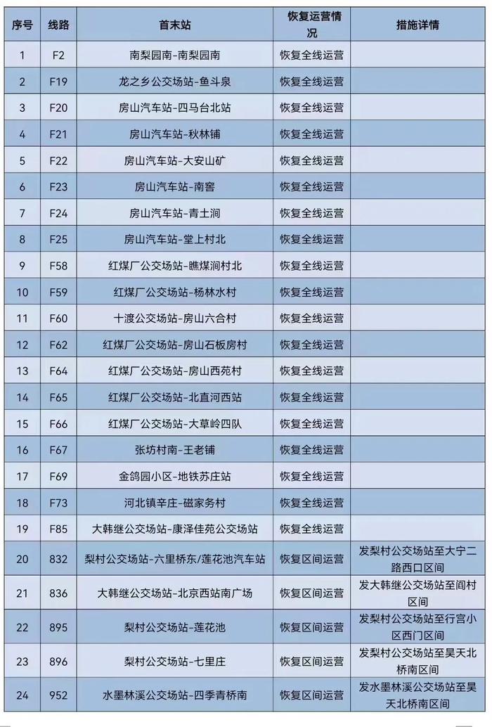 途经房山区的24条公交线路恢复在房山区内的运营。其中19条线路恢复运营,5条线路恢复局部区间运营;
