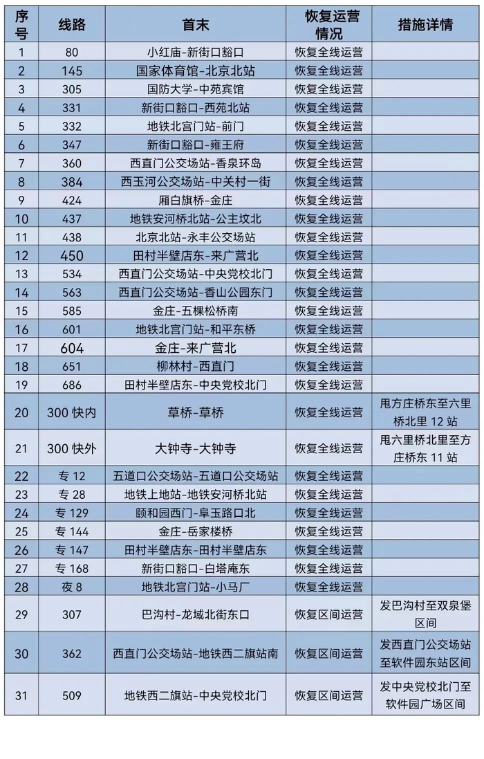 自2022年6月6日首班车起,对途经海淀区的31条公交线路有序恢复运营,其中28条线路恢复运营,3条线路恢复局部区间运营,经过封(管)控区域的8条线路、8个站位仍采取甩站通过措施;