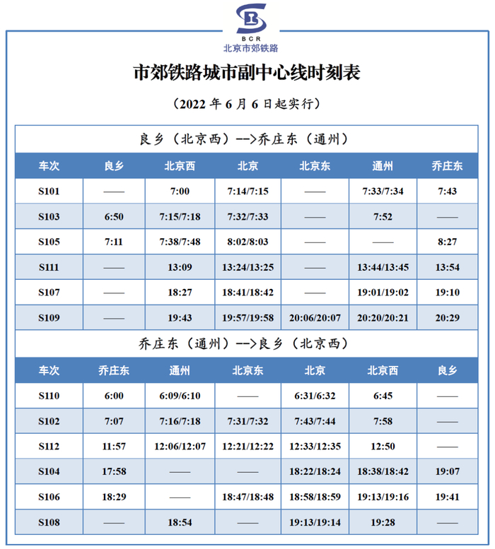 6月6日首班车起,市郊铁路城市副中心线良乡站、北京东站,通密线顺义站、牛栏山站恢复办理市郊列车客运业务。城市副中心线列车时刻表如下所示。