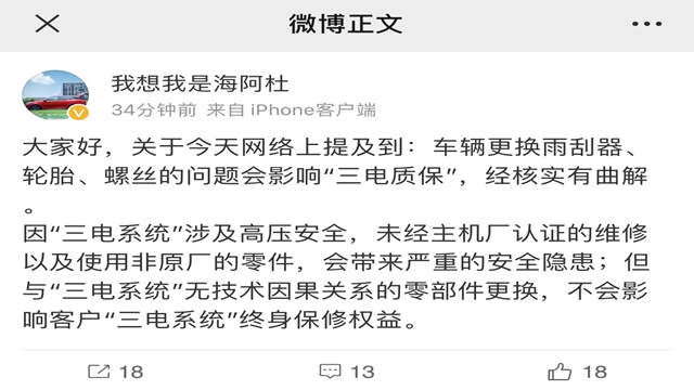 比亚迪汽车品牌及公关副总经理杜国忠今天在微博上表示,网络上提及到,比亚迪车辆更换雨刮器、轮胎、螺丝的问题会影响“三电质保”,经核实有曲解。因“三电系统”涉及高压安全,未经主机厂认证的维修以及使用非原厂的零件,会带来严重的安全隐患;但与“三电系统”无技术因果关系的零部件更换,不会影响客户“三电系统”终身保修权益。