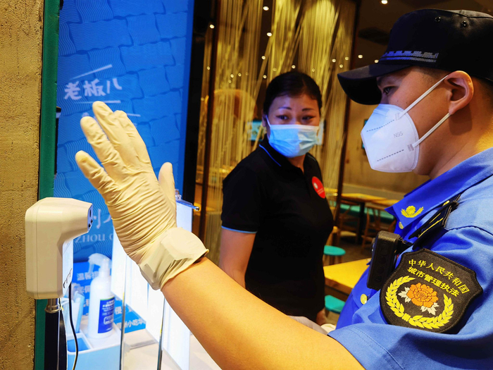 在一家名为“遇见小面”的饭馆门口,综合执法队的王月晨队长对负责人说,“店内就餐人员已经不少了,不能再进人了,餐桌之间要预留一定的距离。”说话间,他仔细查验了该店每天进店的人数和员工疫苗接种情况。据了解,巡查队员每天都要对华贸购物中心的商户进行检查,按照防疫要求监督商户落实。