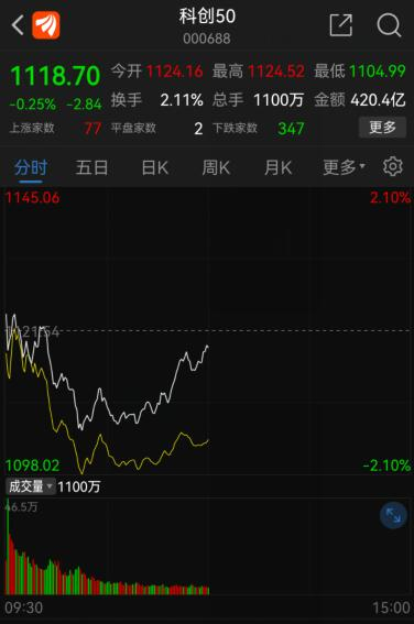 今日,科创50指数早盘收报1118.70点,跌0.25%,成交额420亿。