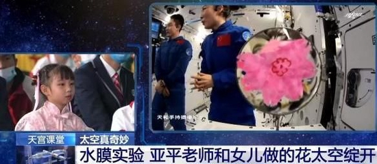 “天宫课堂”授课时,王亚平将她和女儿在地球上一起制作的花朵折纸放进水膜,让女儿亲手做的花朵折纸在太空“绽放”。