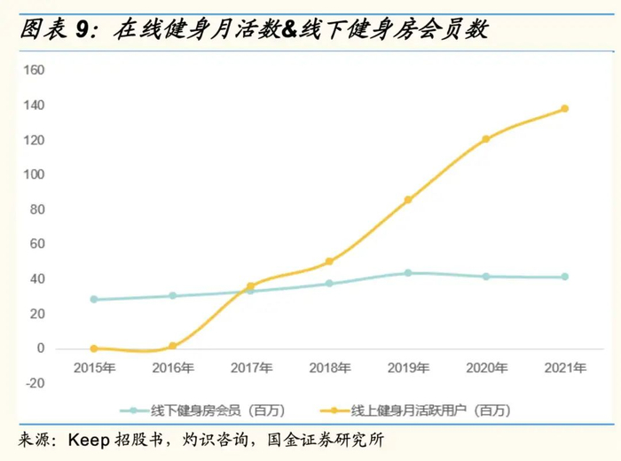 健身市场按渠道划分,可以分为线上健身市场与线下健身市场。近年来,线上健身成为越来越多用户的选择。根据灼识咨询,2021线下健身房会员为4100万,而线上健身会员为1.38亿,预计未来差距将进一步拉大。