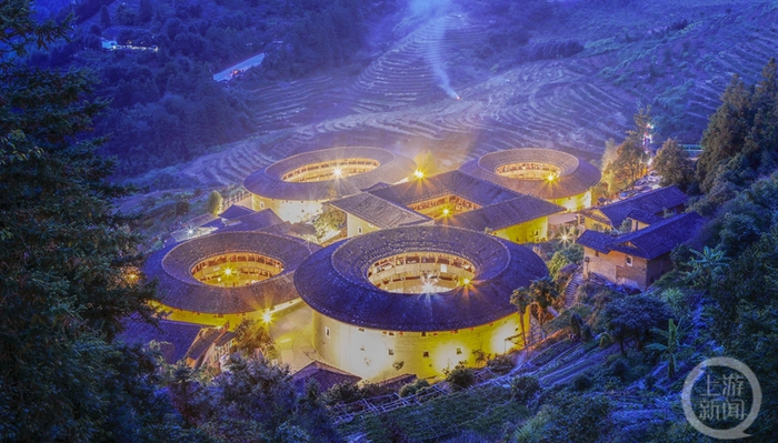 一座座生土夯筑的土楼,依山就势镶嵌在山间,掩映在翠绿林间。