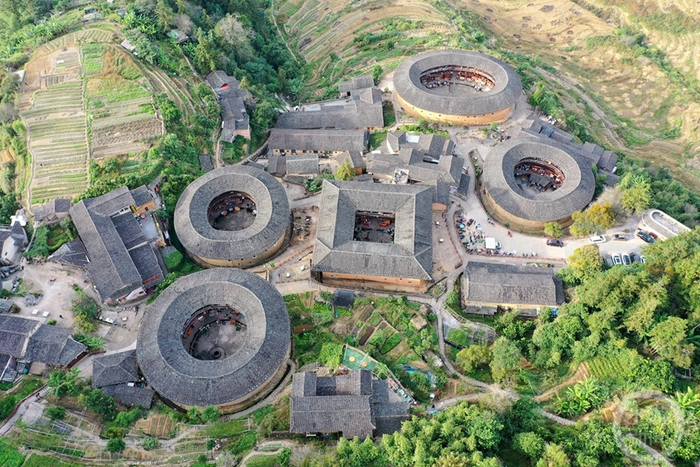 方圆并立,形如“四菜一汤”的土楼群。